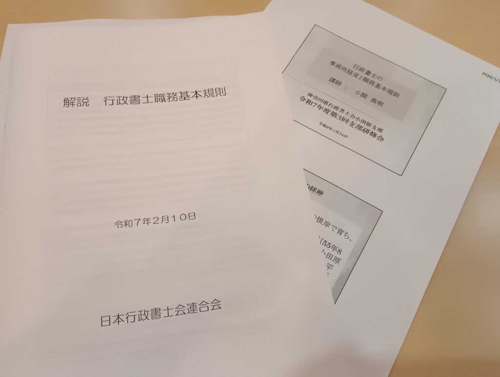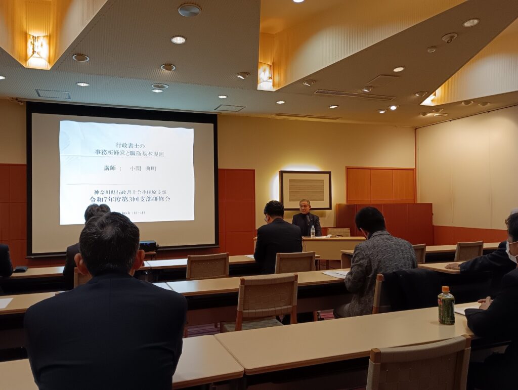 研修会では、地域における行政書士の先駆け的存在でもある小関先生から「事務所経営と職務基本規則」というテーマについて学ばせて頂きました。神奈川県行政書士会で綱紀委員会長をお務めになっている小関先生からわかりやすいご指導を頂きました。